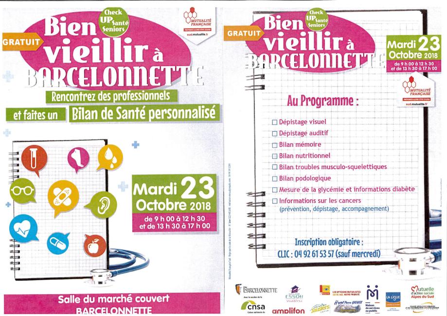 16 octobre 2018 BIEN VIEILLIR A BARCELONNETTE BILAN DE SANTE PERSONNALISE GRATUIT LE MARDI 23 OCTOBRE DE 9H00 A 12H00 ET DE 13H30 A 17H00 SALLE DU MARCHE COUVERT INSCRIPTION OBLIGATOIRE CLIC : 04 92 61 53 57 Infos pratiques Mairie du Lauzet-Ubaye 04 92 85 51 27 Nous contacter A ne pas manquer Actualités Evénements