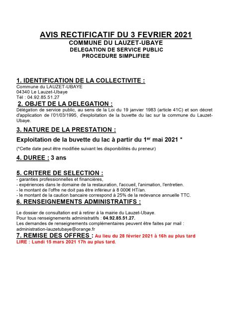 AVIS RECTIFICATIF POUR LA REMISE DES OFFRES DE L'EXPLOITATION DE LA BUVETTE DU LAC.
